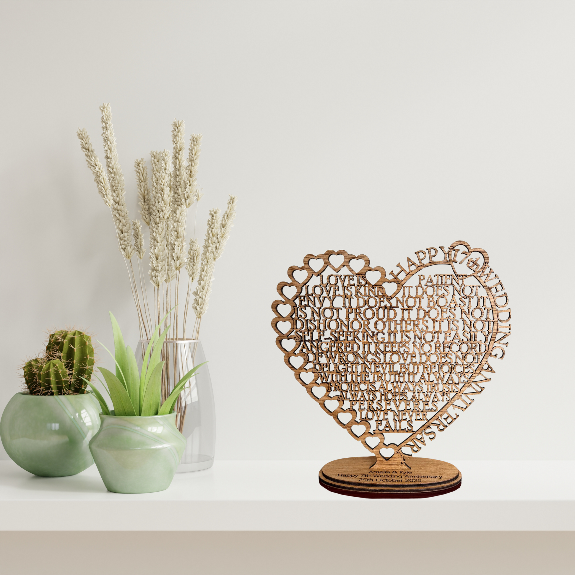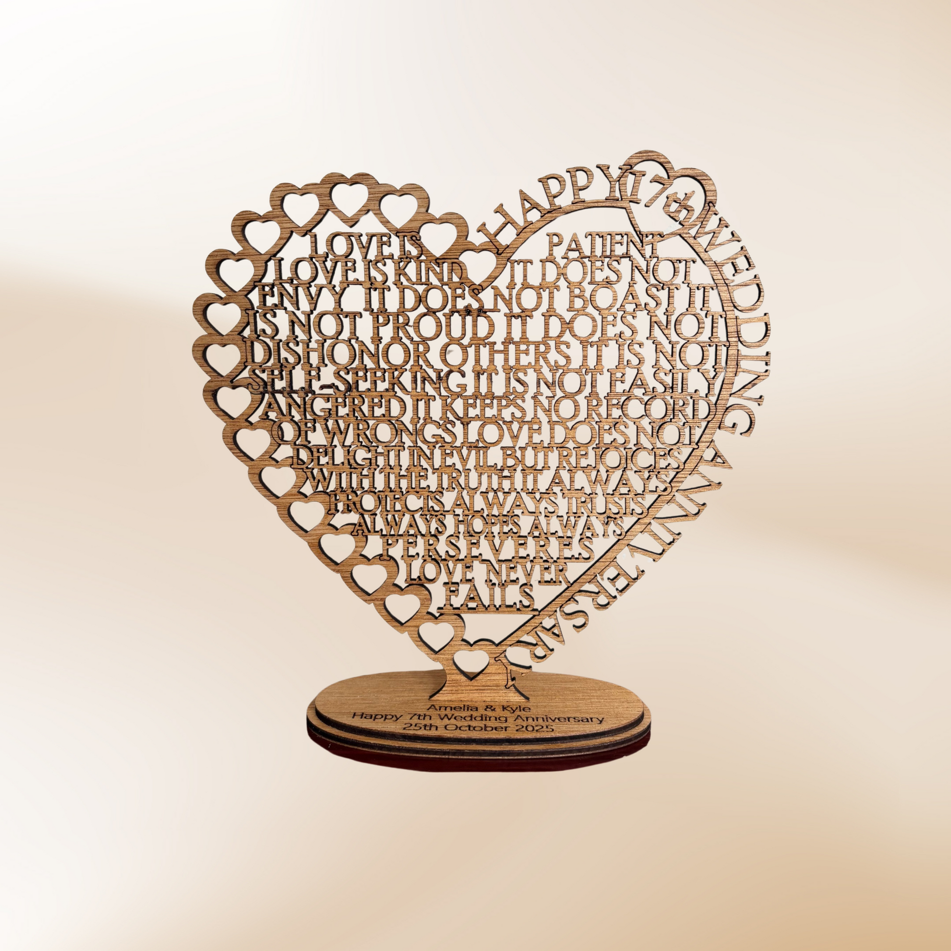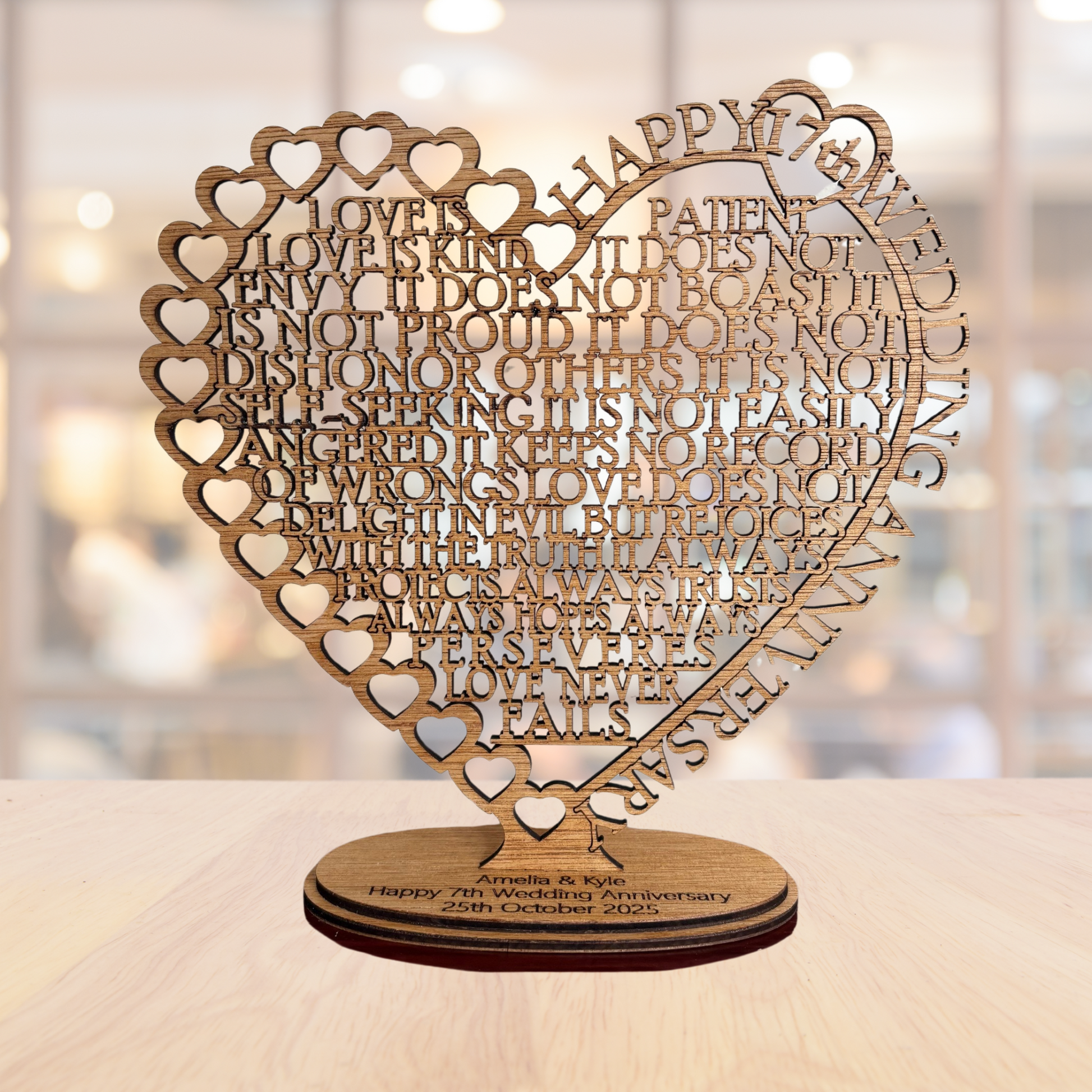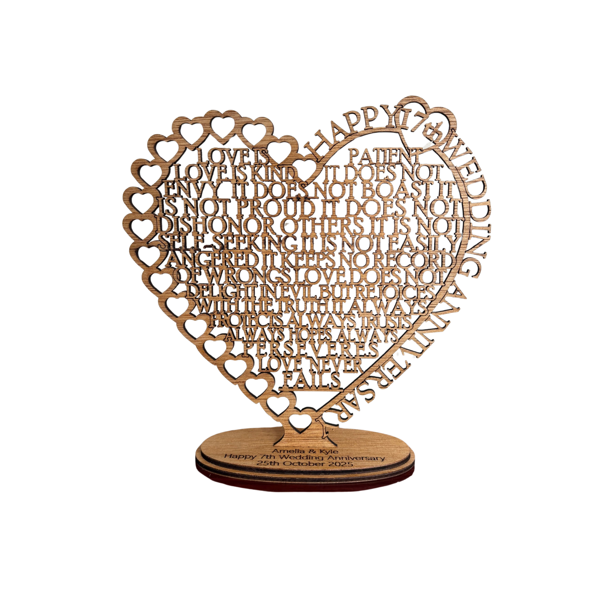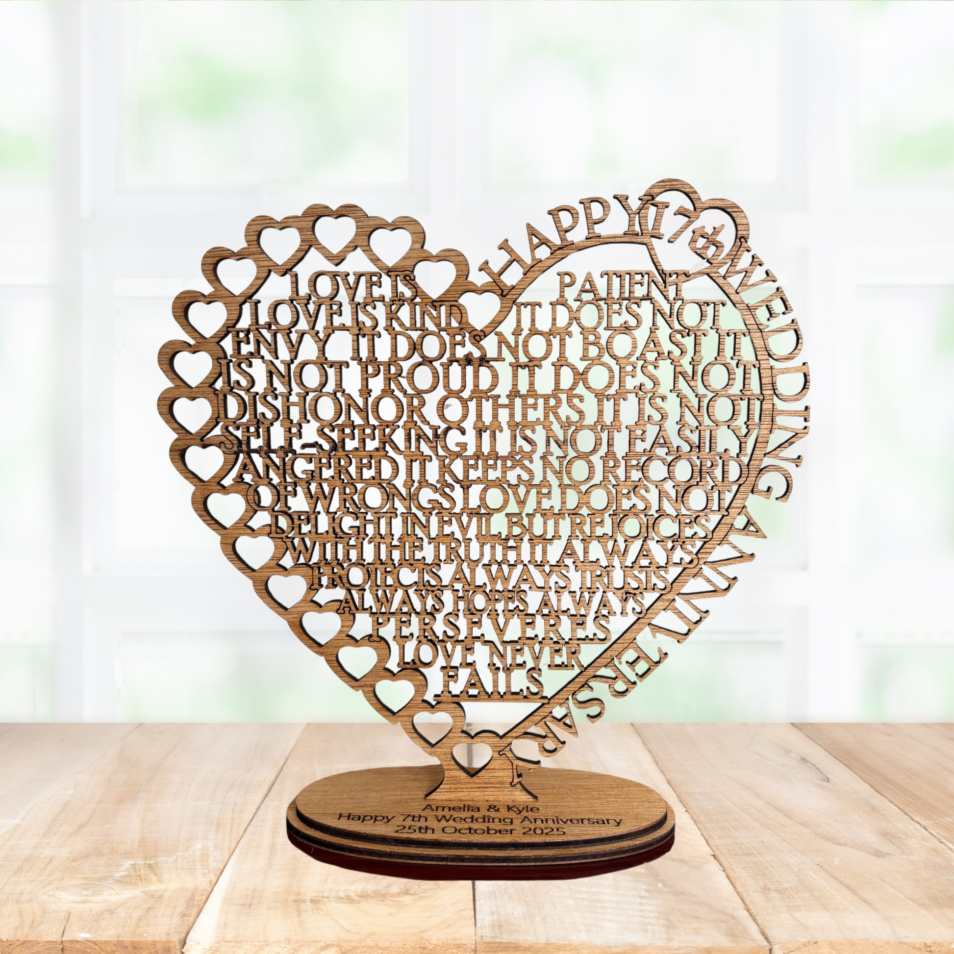 The text laser cut into the heart shape is from Corinthians 13:4: "Love is patient, love is kind. It does not envy, it does not boast, it is not proud. It does not dishonor others, it is not self-seeking, it is not easily angered, it keeps no record of wrongs. Love does not delight in evil but rejoices with the truth. It always protects, always trusts, always hopes, always perseveres. Love never fails."