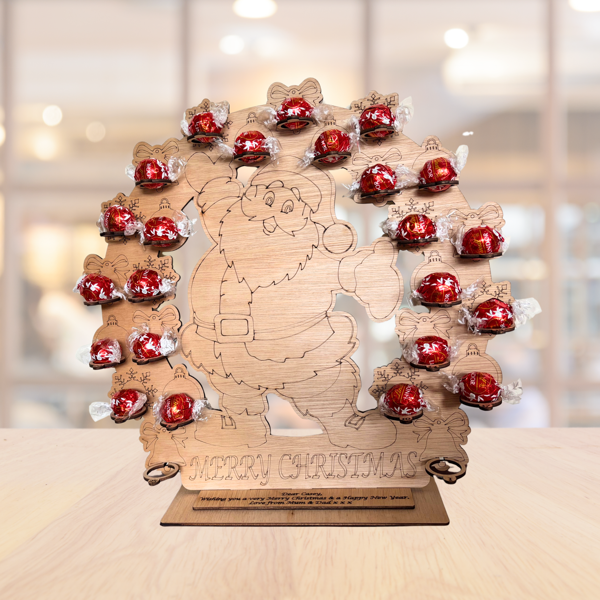The design features Father Christmas with clip in loops which hold Lindt Lindor. There are 24 rings which can be clipped into the back board. Gently rest the chocolate balls on top of the loops.